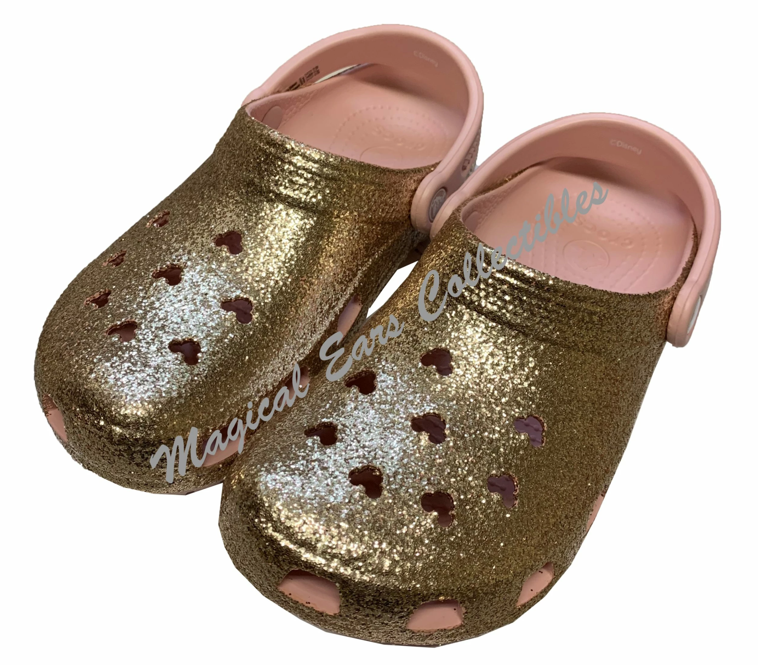 Make every stroll sparkle with these ultra comfy clogs for adults by Crocs. The uppers are covered in Briar Rose Gold glitter and feature Mickey icon-shaped ventilation holes for swell and stylish stepping.