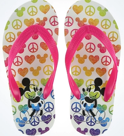 Your Mickey Fan will have some fun in the sun in style with these comfortable Peace Love Mickey Mouse Flip Flops. This casual footwear smiles with sunny style for a walk on the beach or anytime.