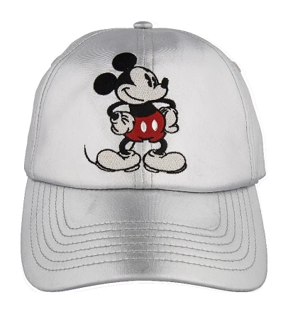 Features a embroidery of Mickey on a silver cap.