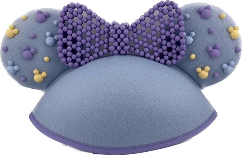 You’ll be feeling both blue and in the pink when wearing this decorative Minnie Mouse earhat. The blue padded ears are covered in colorful Mickey icon beads which are complemented by the large purple beaded bow that tops off this delightfully cute headwear.