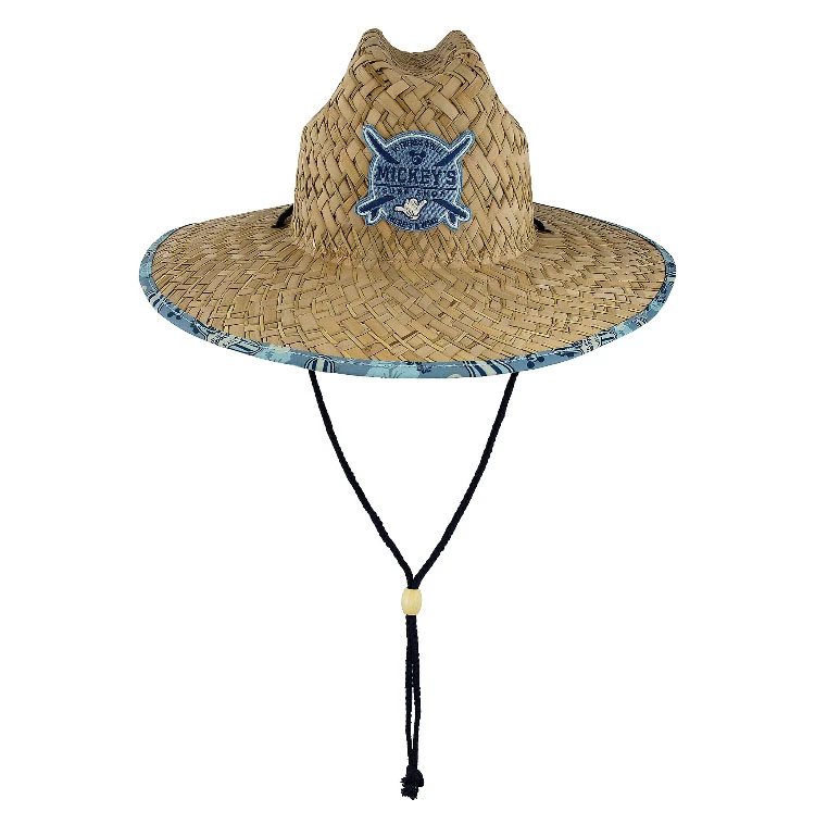 Have fun in the sun all summer long under this wide brimmed straw hat with Mickey’s Surf Shop logo and chin strap.